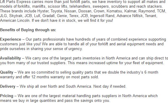 We provide you the best deals on all parts for your fleet of forklifts. If you are interested in getting a quote for our parts or attachments, give us a phone call today at: